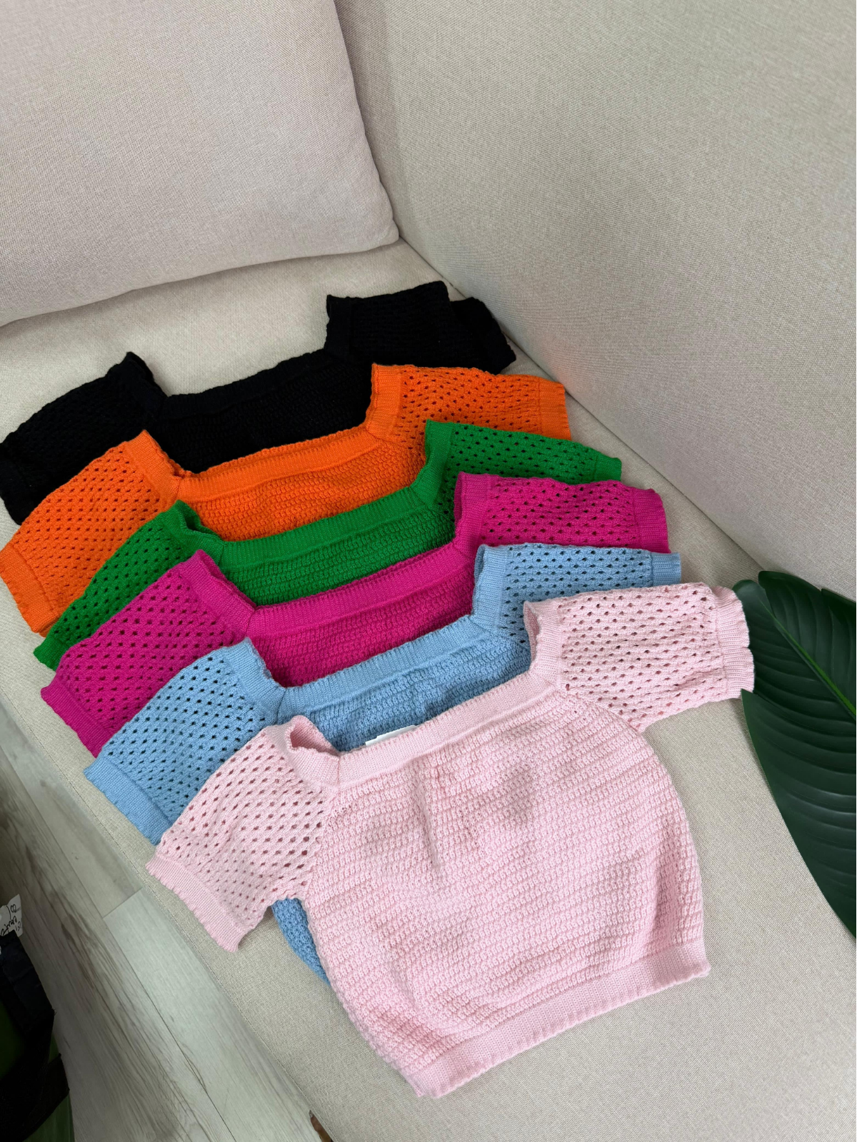 Blusa confeccionada em um tricô leve e macio com detalhe vazado nas mangas. Possui decote quadrado e mangas curtas.