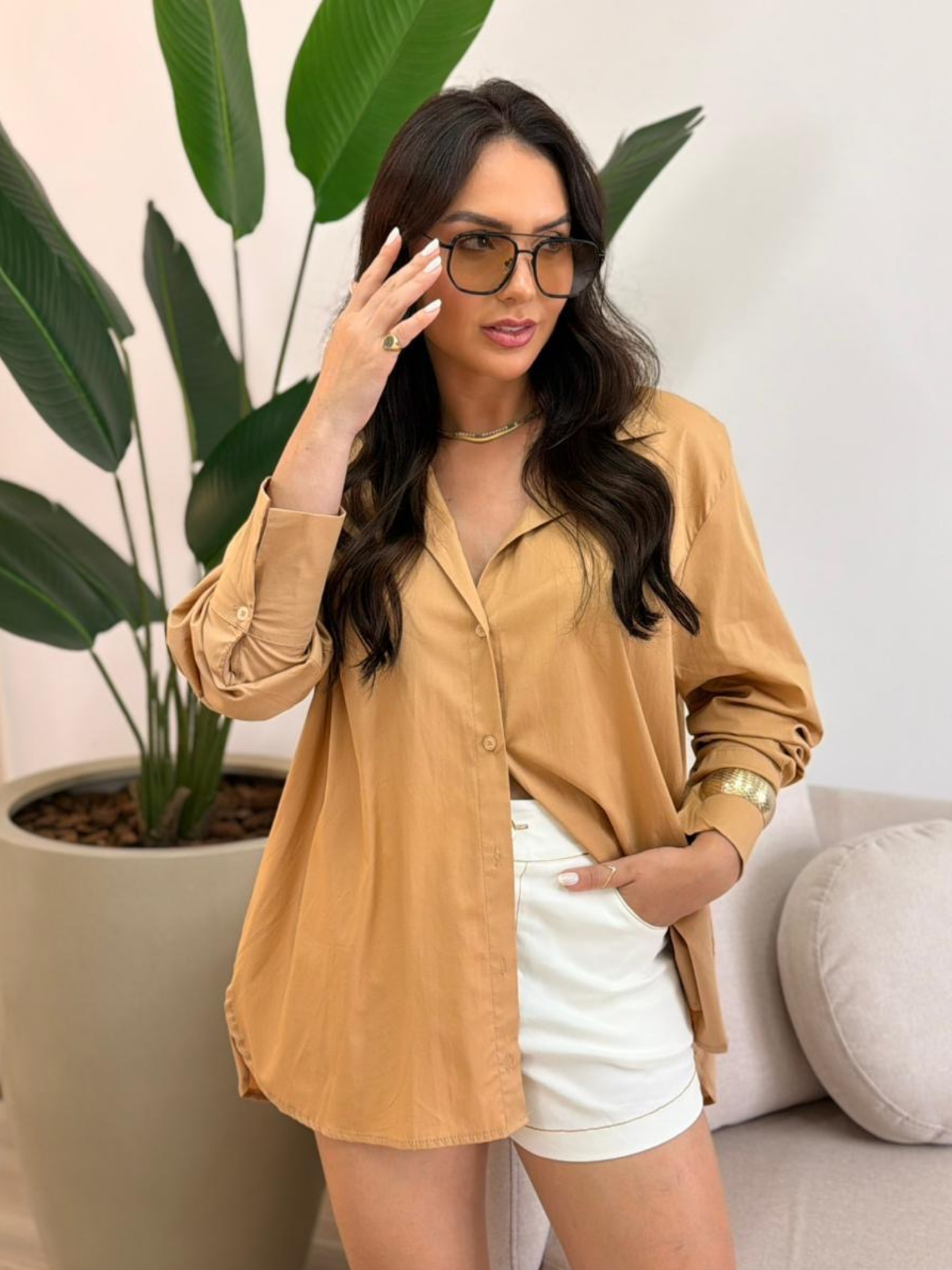 Camisa em tricoline, modelagem mais ampla over, possui punho com fechamento em botão. Sua modelagem mais over permite transitar facilmente em diversos estilos, indo de uma produção mais social até sob um biquini como saida de praia.