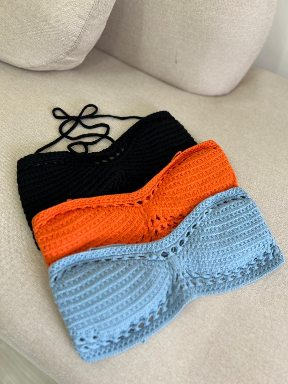 Cropped confeccionado em um tricô leve e macio com elastano, possui amarração nas costas.